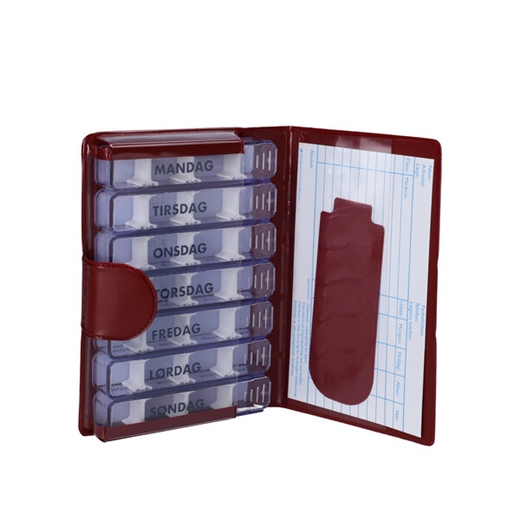 Den bordeaux farvede kunstlædermappe med velcro lukning (10,5 x 15,5 x 2,5 cm) indeholder 7 æsker, 1 for hver ugedag.