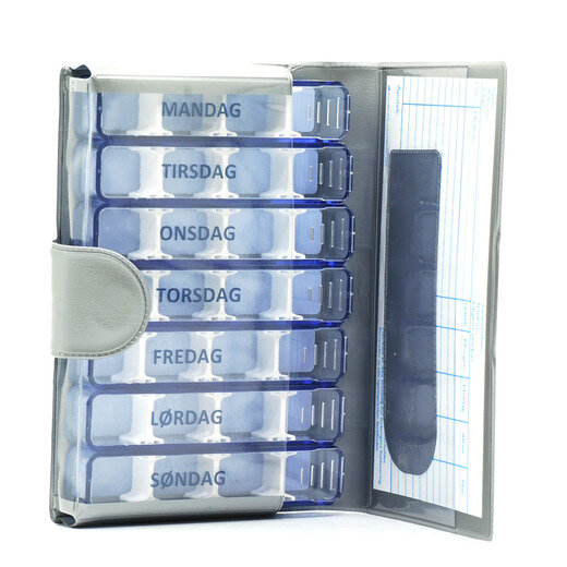 Et medicinkort / doseringskort samt etui til en enkelt dagsæske er vedlagt.