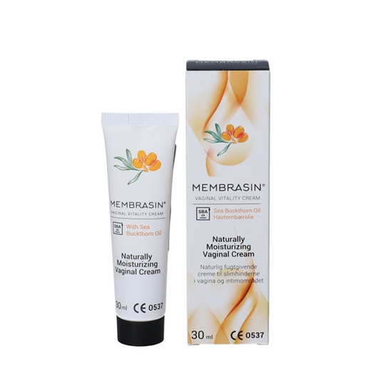 Membrasin Vaginal Vitality Cream indeholder blandt andet havtornbærolie, der styrker og beskytter slimhinderne og huden i intimområdet.