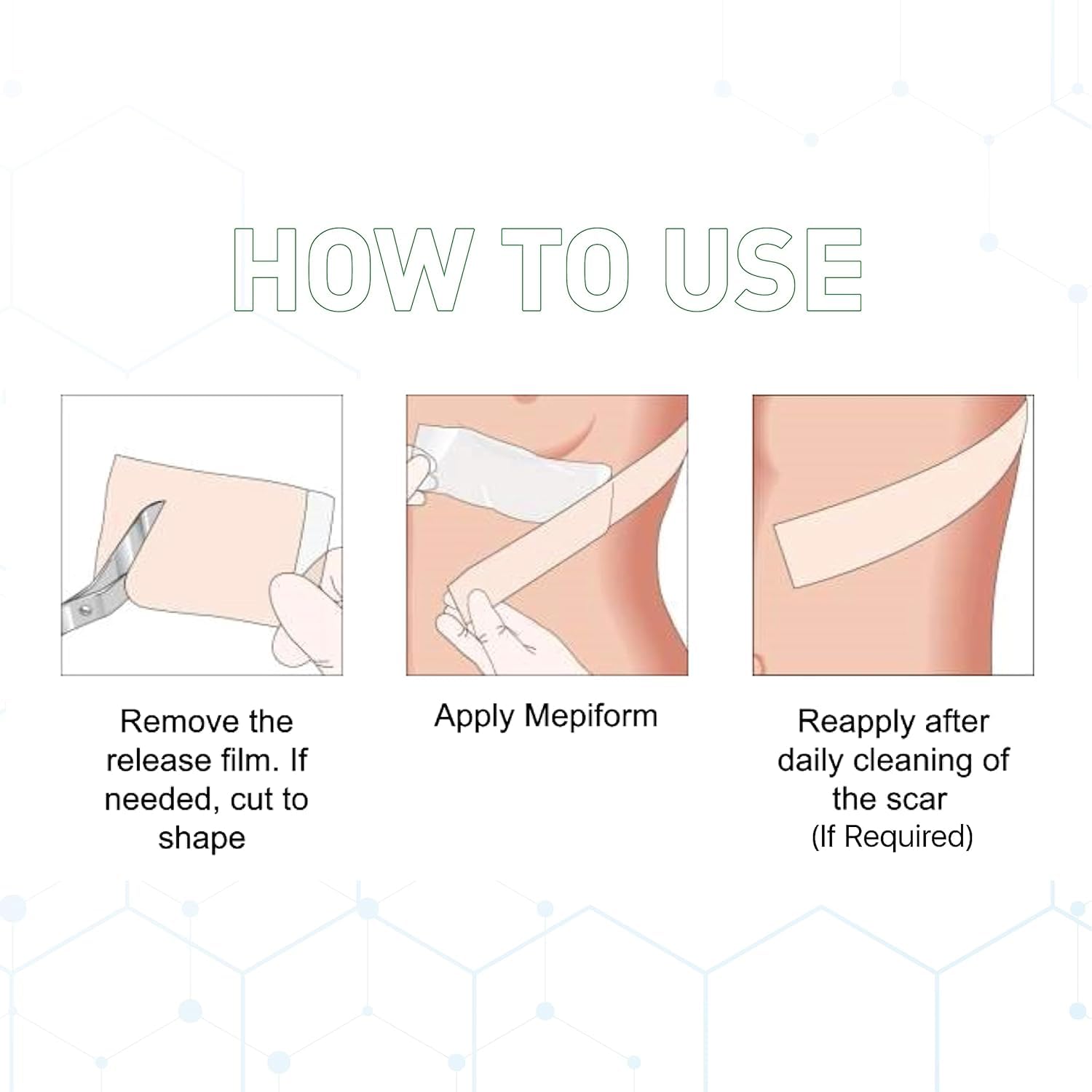 Fjern bagsidefilmen, og applicer Mepiform på arret.