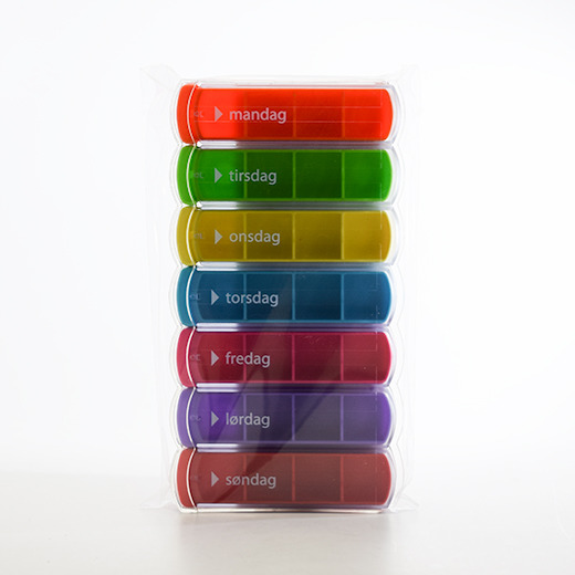 Mininizer Colour Rack er en medicindoseringæske, der består af syv forskellig farvede doseringsæsker, – én til hver dag i ugen.