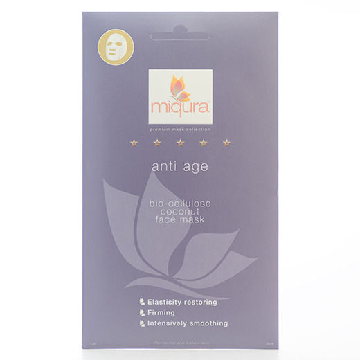 Miqura anti age face mask er en bio-cellulose maske, fremstillet af fermenteret kokosjuice. Fibrene i denne maske er finere end i traditionelle bomulds-masker. Dette bevirker, at masken kommer mere i berøring med huden, og huden absorberer gelen bedre.