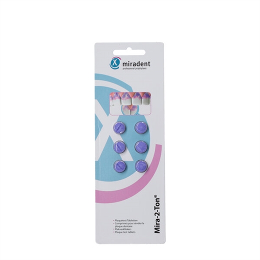 Miradent Mira-2-Ton er en farvetablet, der afslører mangelfuld tandbørstning.