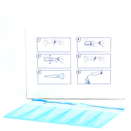Termometret anbringes i det transparente overtræk, og det blå beskyttelsespapir fjernes inden indføing.