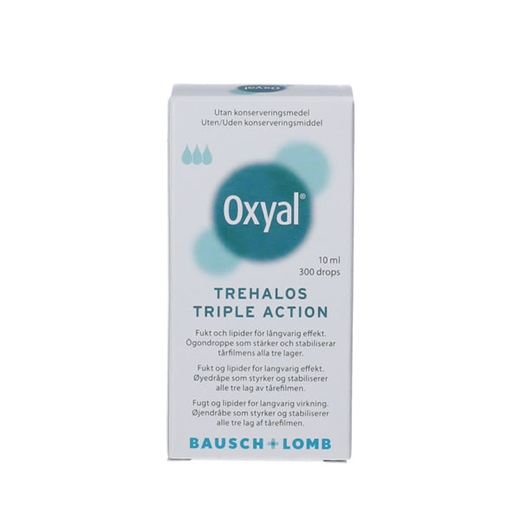 Oxyal Trehalos Triple Action er fugtgivende, beskyttende og smørende øjendråber til forebyggelse og behandling af moderat og svær øjentørhed.