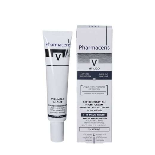 Pharmaceris V Viti-Melo Repigmentation Night Cream er en repigmenterende natcreme til vitiligo påvirket hud i ansigtet og på kroppen.