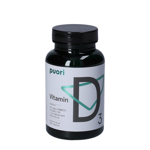 Puori Vitamin D3 indeholder 62,5 µg (2500 IE) D3-vitamin / Cholecalciferol, svarende til 1250 % RI*.