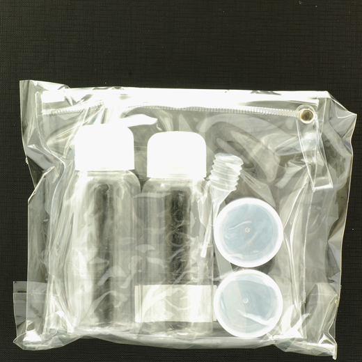 Tasken indeholder 2 tomme flasker (á 100 ml) med skruelåg, 2 krukker med skruelåg, 1 pumpe og 1 spatel.