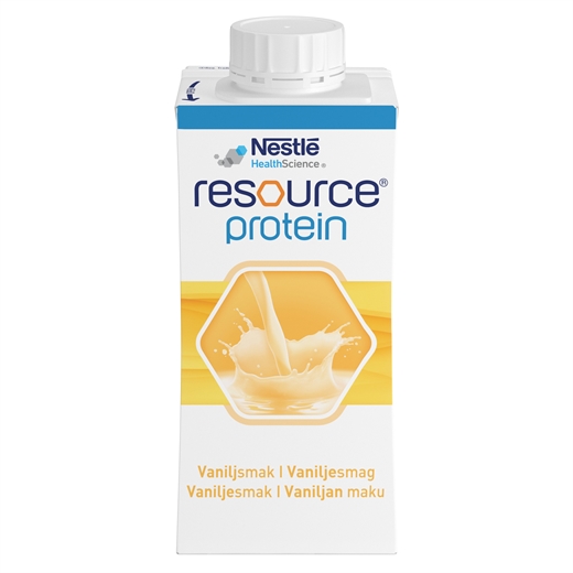 Resource® Protein er en ernæringsmæssigt fuldgyldig ernæringsdrik med højt proteinindhold og relativt lavt fedtindhold. Til ernæringsmæssig håndtering af patienter med underernæring eller i ernæringsmæssig risiko, som har et forhøjet proteinbehov. Passer også godt til patienter der har behov for en ernæringsdrik med lavere fedtindhold.