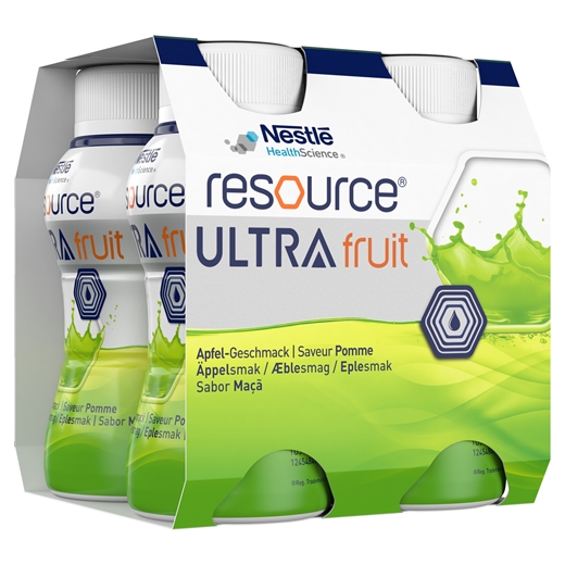 Resource Ultra Fruit Æble er et koncentreret ernæringstilskud i flydende form med et højt indhold af protein og energi. Ernæringsdrikken ligner saft, smager af æble og er letdrikkelig.