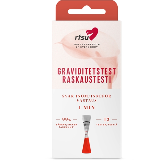 Hurtigt og 99 % pålideligt graviditetstest. Klart resultat inden for 1–5 minutter. Testet kan tages fra den dag, du skulle have haft din menstruation. Indeholder 12 brugervenlige teststrimler, som dyppes i en beholder med urin. Testets følsomhed er 25 mlU/ml.