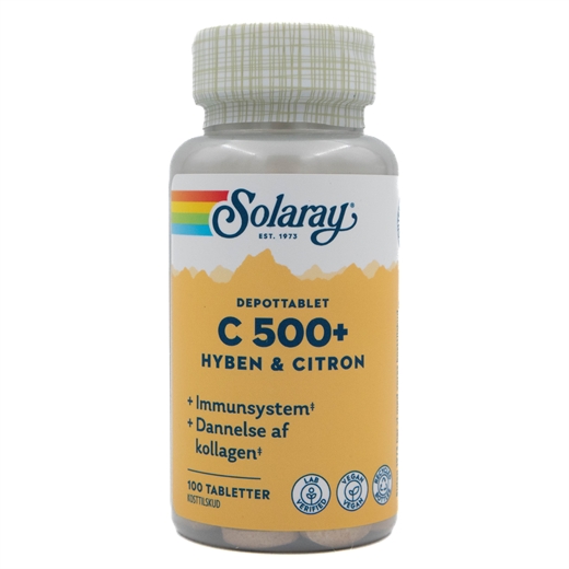 C500+ fra Solaray er et vegansk kosttilskud med vitamin C, hyben og citron. Denne variant kommer i form af depottabletter, som er udviklet specielt til at sikre en stabil tilførsel i løbet af dagen i takt med, vitaminet opløses gennem mave-tarm-kanalen. Solaray C500+ giver dig 500 mg vitamin C pr. daglig dosis, hvilket svarer til 625% RI.