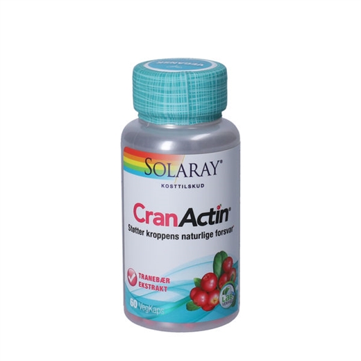 Solaray CranActin kapsler er et vegansk kosttilskud med tranebær af arten Vaccinium macrocarpon Aiton og vitamin C.