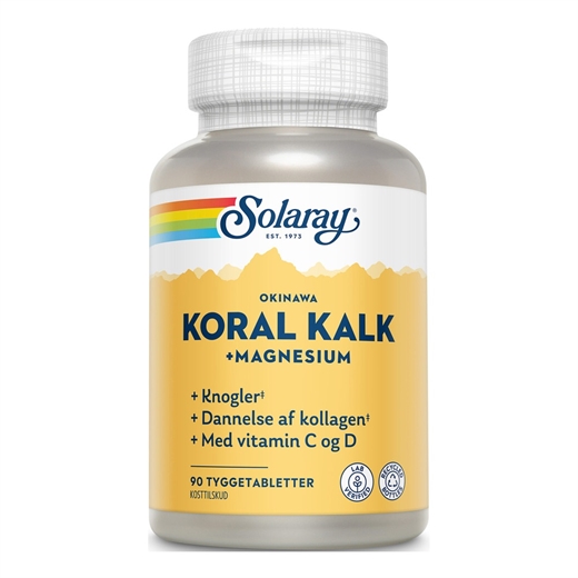 Solaray Koral Kalk + Magnesium er et kosttilskud i form af tyggetabletter, der har en dejlig smag af frugt. Tilskuddet indeholder Okinawa koralkalk, som stammer fra Okinawa i Japan. Tabletterne indeholder også magnesium og vitamin D, der sammen med calcium hjælper til vedligeholdelse af normale knogler og tænder. Vitamin D bidrager desuden til en normal optagelse og udnyttelse af calcium. Vitamin C bidrager til immunsystemets normale funktion samt til normal dannelse af kollagen, der har betydning for normalt fungerende knogler, brusk, tandkød og tænder.