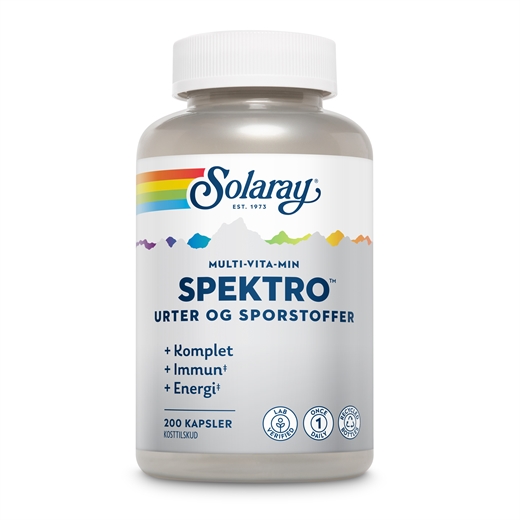 Solaray Spektro Multi-Vita-Min med Urter er et kosttilskud indeholdende 13 vitaminer, 8 mineraler, spormineraler og urter.