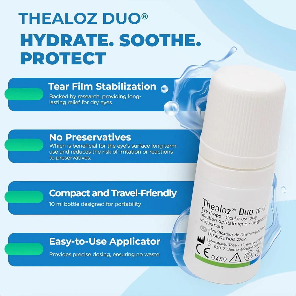 Thealoz Duo anbefales ved problemer med tørre øjne (ubehag, stikkende følelse, irritation) og træthed af øjnene, som skyldes udefrakommende faktorer såsom vind, røg luftforurening, støv, tør varme, klimaanlæg, flyrejser eller længerevarende arbejde foran en computerskærm.