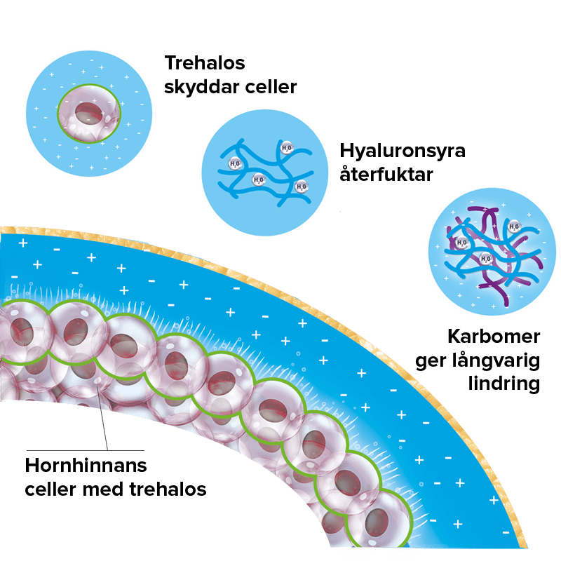 Natriumhyaluronat er et naturligt polysaccharid, der forekommer i det menneskelige øje og som har vandbindende egenskaber. Dette giver en forbedret fugtning og smøring af hornhindens overflade samt langvarig lindring.