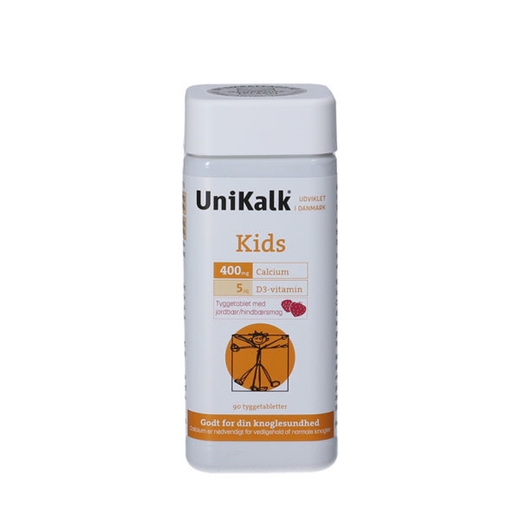 UniKalk Kids er et kostilskud, som indeholder 400 mg calcium (kalk) og 5 µg D-vitamin pr. tyggetablet.