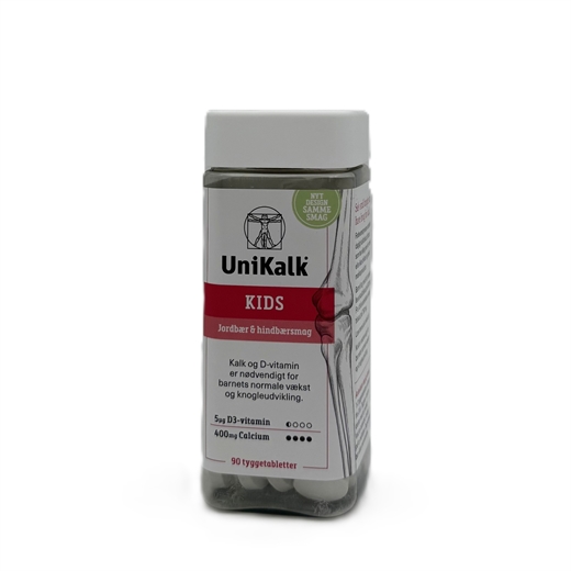 UniKalk Kids er en tyggetablet med jordbær/hindbærsmag.