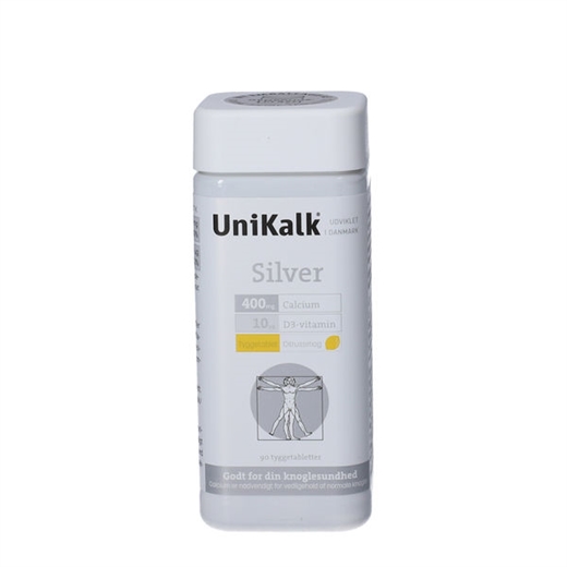 UniKalk Silver er et kostilskud, som indeholder 400 mg calcium (kalk) og 10 µg D-vitamin pr. tablet.