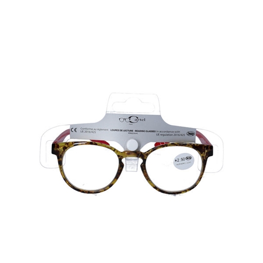 Brillen er i et tidløst skildpaddemønster med røde brillestænger.