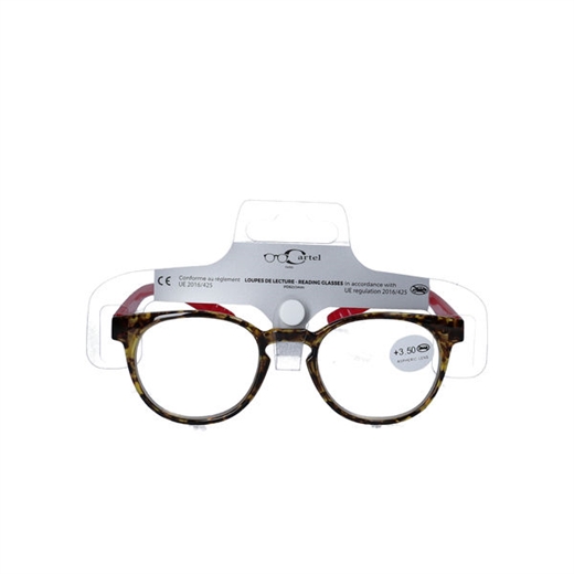 Brillen er i et tidløst skildpaddemønster med røde brillestænger.