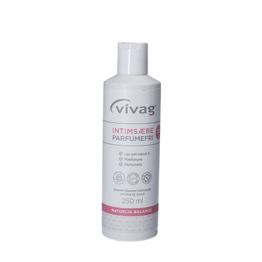 Vivag Intimsæbe indeholder mælkesyre og har en lav pH-værdi på 4, så den understøtter den naturlige pH-balance og beskytter mod irritation og udtørring af huden. Produktet er plejende og med en blød konsistens, som gør den nem at skylle af kroppen.