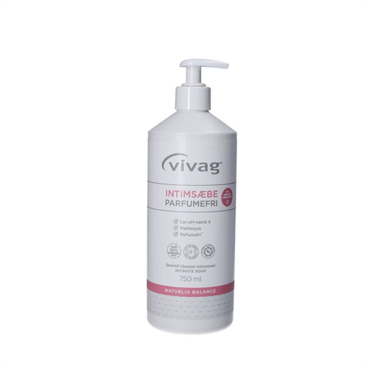 Vivag Intimsæbe indeholder mælkesyre og har en lav pH-værdi på 4, så den understøtter den naturlige pH-balance og beskytter mod irritation og udtørring af huden. Produktet er plejende og med en blød konsistens, som gør den nem at skylle af kroppen.