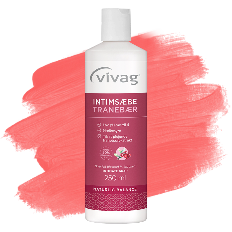 Vivag Intimsæbe Tranebær vasker og plejer huden i intimområdet, – uden at forstyrre balancen eller irritere huden.