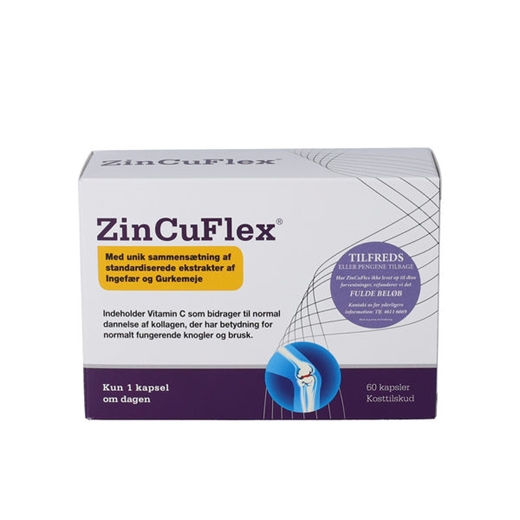 Kosttilskudet ZinCuFlex er en sammensætning af standardiserede ekstrakter fra ingefær og gurkemeje. Dette kompleks er ydermere tilsat C-Vitamin, som også har en betydning for normalt fungerende knogler og brusk.